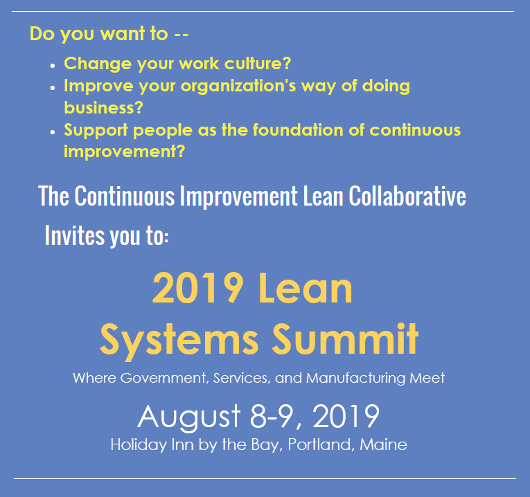 The 2019 CILC Lean Systems Summit will be held on August 8 & 9, 2019 in Portland, Maine at the Holiday Inn by the Bay.